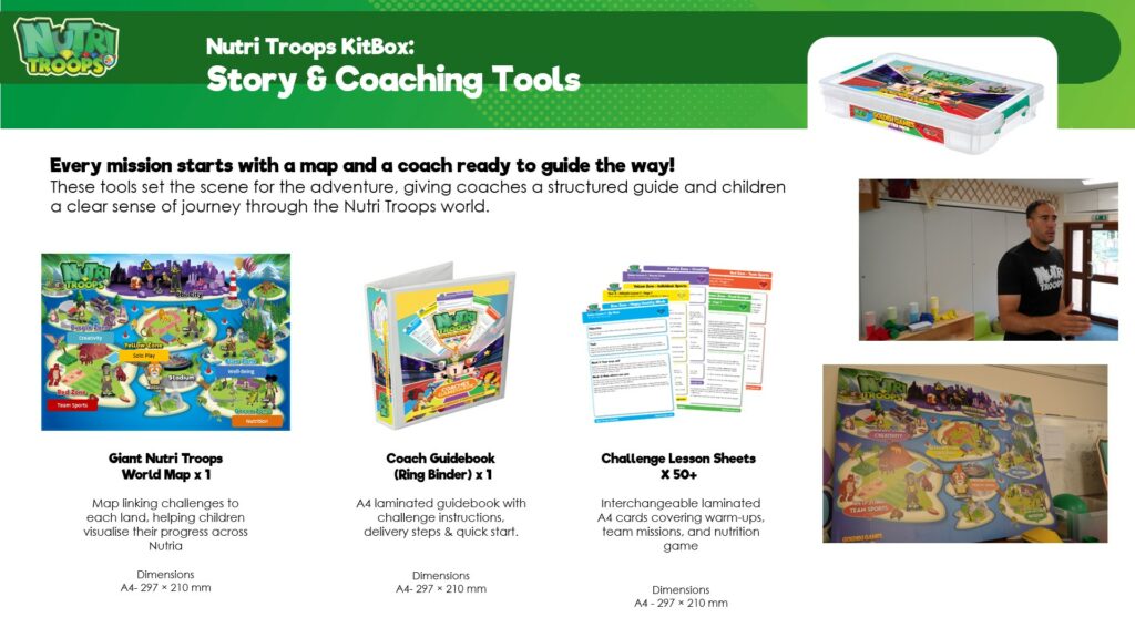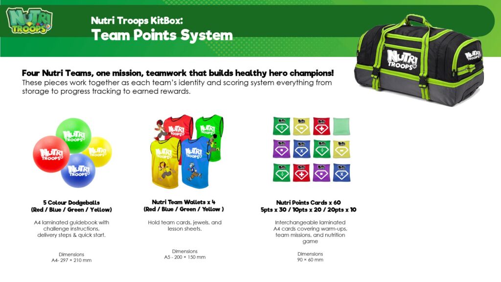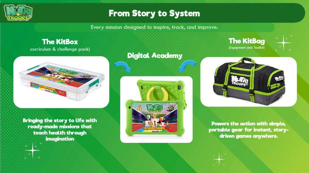 Bring your school or club to life with the Nutri Troops Academy & KitBox, a complete system that makes health, teamwork, and nutrition exciting, measurable, and story-driven.