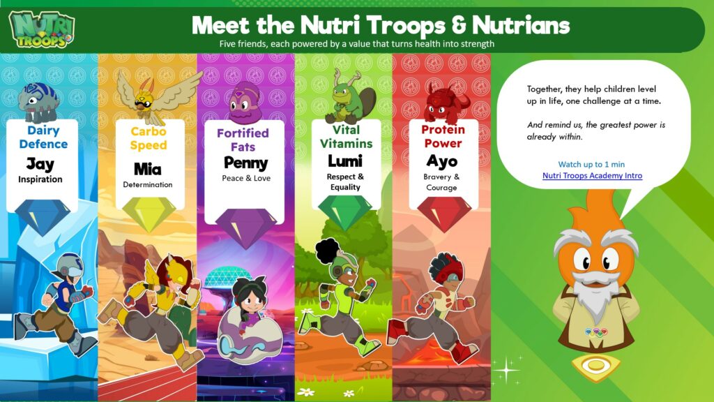 Nutri Troops is a vibrant health and fitness programme combining animated storytelling, Olympic-inspired challenges, and engaging workshops that bring the national curriculum to life.